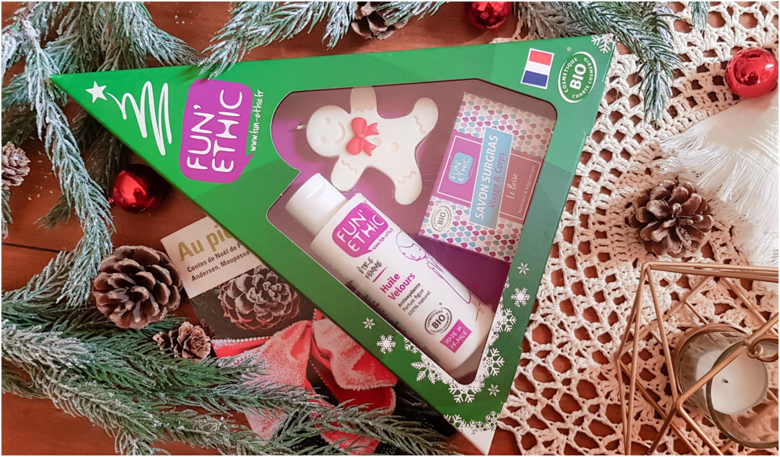 Cette année Fun Ethic propose un coffret de Noël avec trois produits bio, vegan et cruelty fabriqués par des artisans en Alsace. En effet, cette marque française et bio propose ici un savon saponifié à froid senteur “boisé”. Il laisse la peau toute douce et est vraiment agréable à utiliser. Il y a également une huile velours hydratante pour le visage, le corps et les cheveux qui sent bon la figue. Quand à la petite bougie en forme de “Mannele”, elle sent bon le pain d’épice et elle est en cire de colza. Enfin, la boite en forme de sapin est 100% recyclée et recyclable. Aussi, j’ai trouvé que ce coffret et ces produits étaient une bonne idée de cadeaux éthiques pour Noël.