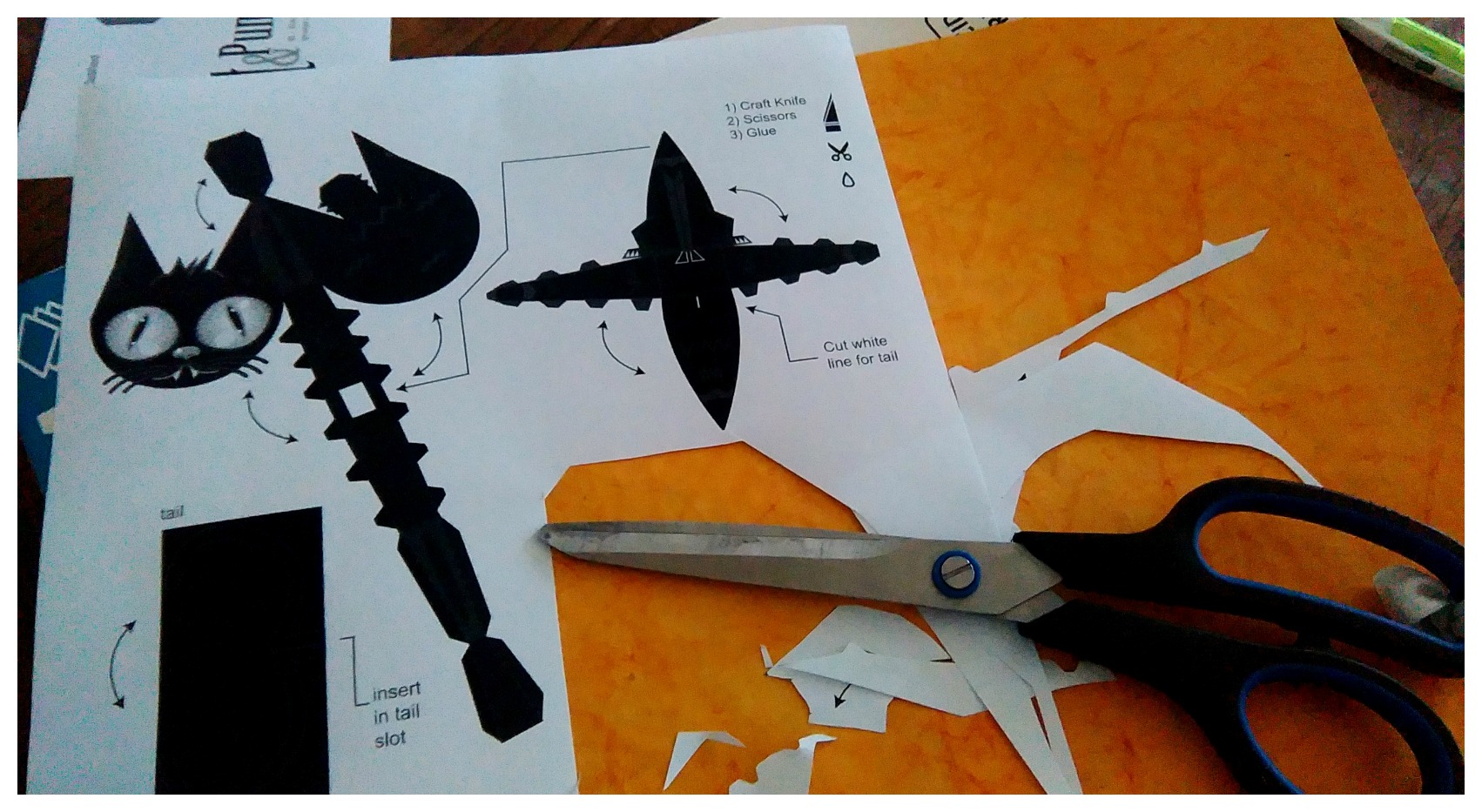Si la citrouille est facile à assembler pour des enfants de 5 et 7 ans, le chat est un peu plus compliqué … Le découpage du chat noir est un peu alambiqué. Il faut donc être très minutieux et patient. Idem pour l’assemblage. Confiez cet animal là à un enfant de 8-9 ans minimum. Perso j’ai laissé les citrouilles d’Halloween au Loulou et à la Poulette, et je me suis attaquée au chat noir, deux fois (bah oui sinon ça fait des jaloux ;p ).