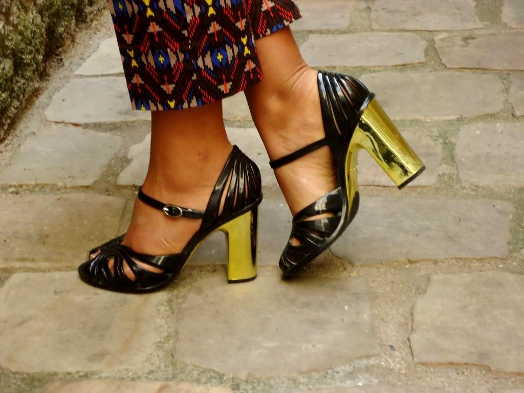 J’aime beaucoup les tissus africains type wax, leurs imprimés et j’ai trouvé que celui ci était un bon mix entre la tendance graphico-géométrique et le wax africain. J’ai failli sortir pour l’occasion ma pochette jaune en croco mais ça faisait un peu too much… J’ai donc finalement opté pour ce sac bowling (mon ptit chouchou depuis lundi) et des ongles du même bleu (OPI ‘DS Magic’) en accord avec l’imprimé de ma tenue. Pour mes petits pieds, j’ai choisi ces salomés de chez Mélissa. Elles sont confortables et super stables avec leurs talons carrés, en bref de très bons alliés pour ne pas s’étaler sur les pavés bordelais!