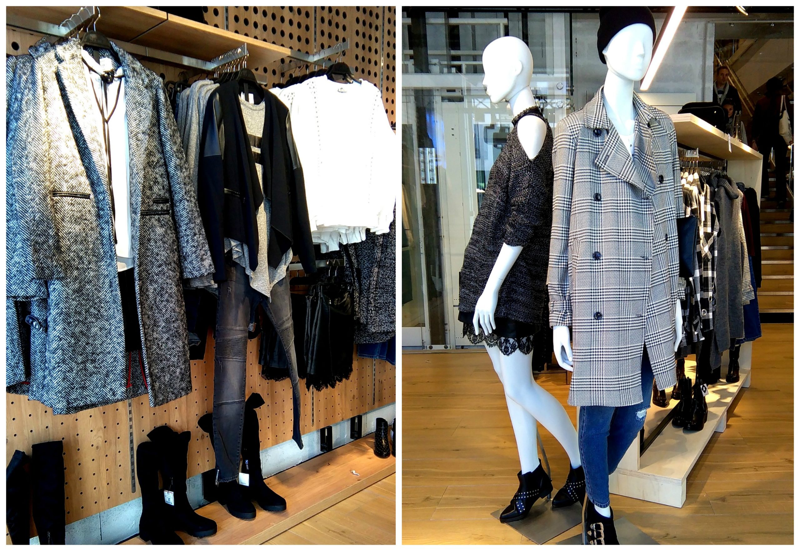 On trouve à l’entrée du magasin un thème City composé de robes noires avec des détails en dentelle, des manteaux longs et 3/4 à carreaux noirs et blancs, des chemises, pantalons, jeans… Des pièces à la fois élègantes et tendances accompagnées de bons basiques.