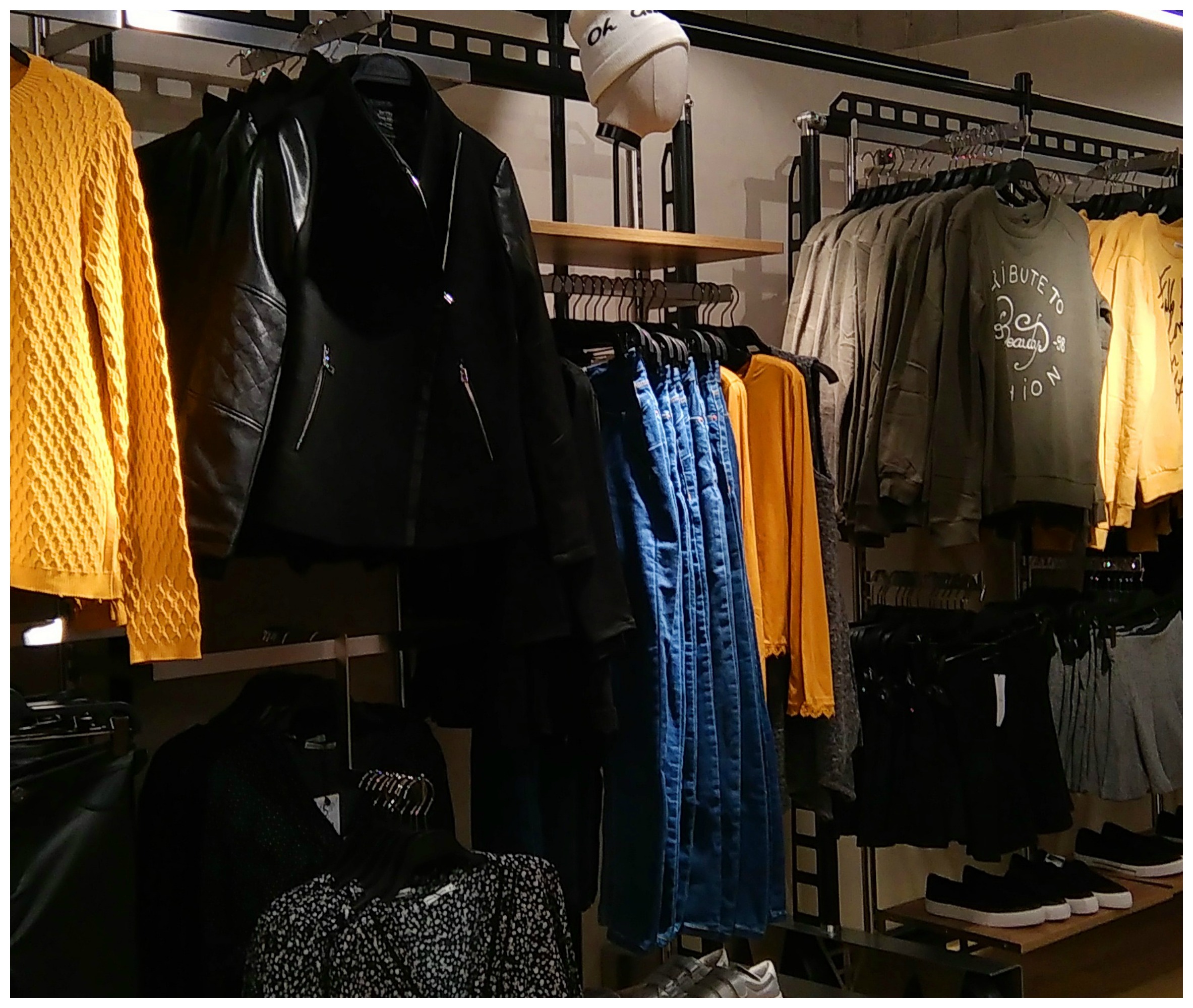 Au centre du magasin, un thème plus rock composé de perfecto en simili, jeans noirs délavés et sweats siglés, des pièces tendances dans les tons de gris, rouge et noir.