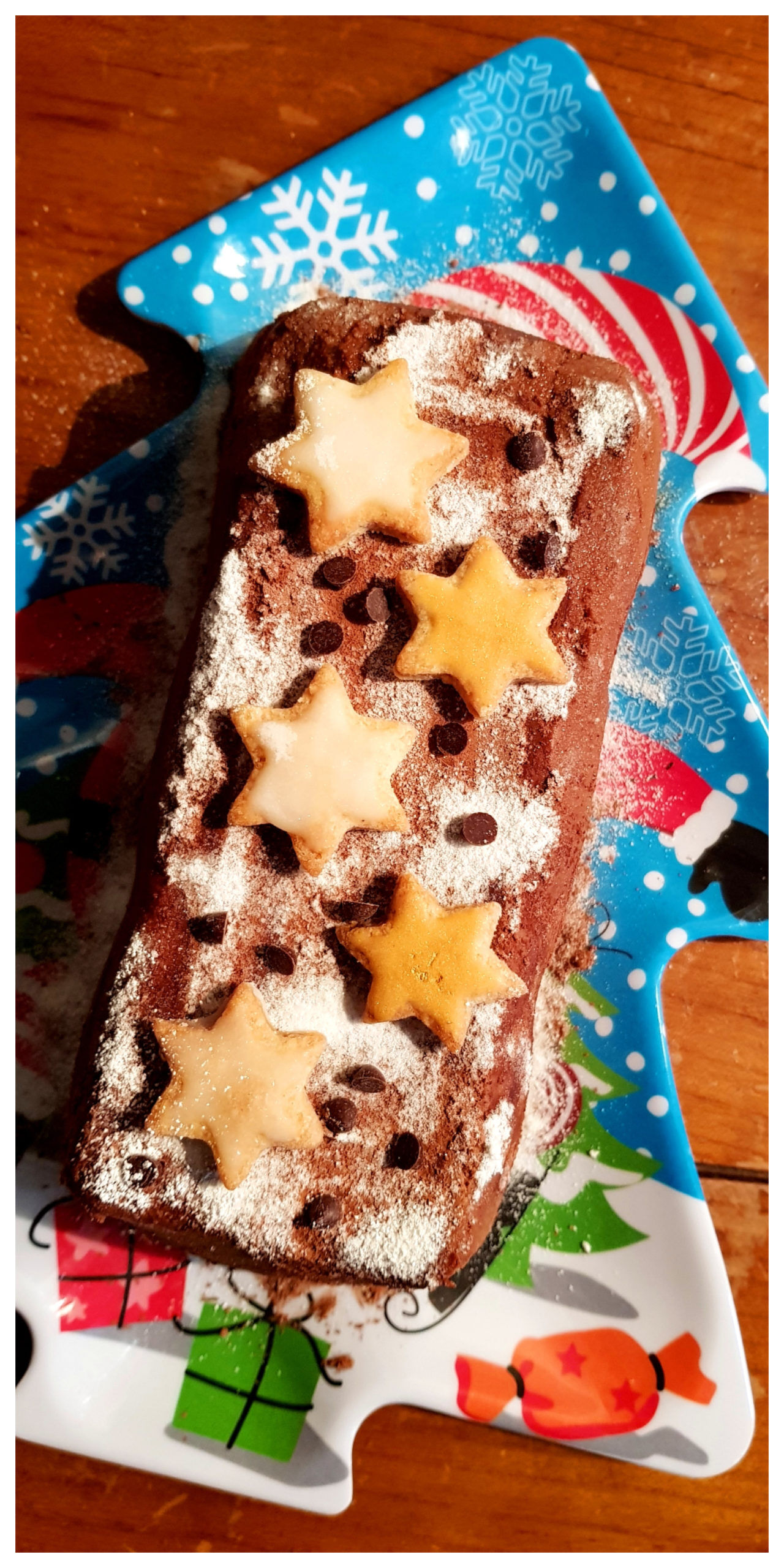 Pour ma part j’ai décoré ma bûche vegan avec des sablés vegan en forme d’étoiles. En effet, vous pouvez aussi ajouter par exemple des copeaux de chocolat, des candy cane ou des décorations sur piques qu’on trouve en magasin. D’autre part, il est également possible d’ajouter à la préparation finale des noisettes, amandes ou morceaux de biscuits vegan et sans gluten pour un effet croustillant.