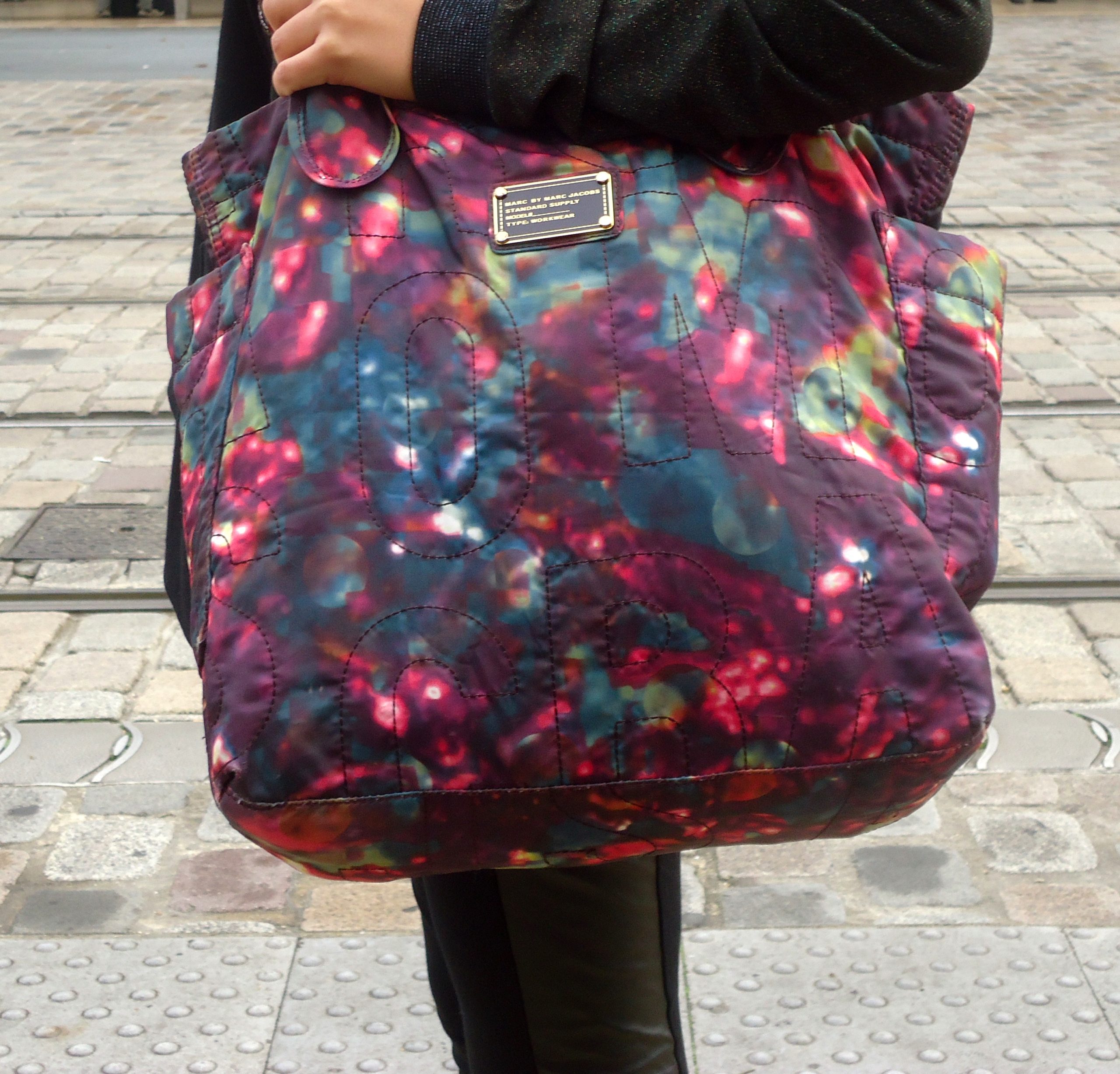 Passons au sac et pochettes. J’ai choisie ce sac Marc by Marc Jacobs ‘pretty medium tate’ en Nylon pour sa taille et ses poches extérieures et intérieures, hyper pratiques pour ranger le lunettes, les clés, le téléphones, les billets de trains, la pochette I-pad, la pochette ordi… Le plus de ce sac, c’est aussi son poids: Vu qu’il est en nylon, il est super léger, beaucoup plus léger qu’un sac en cuir.