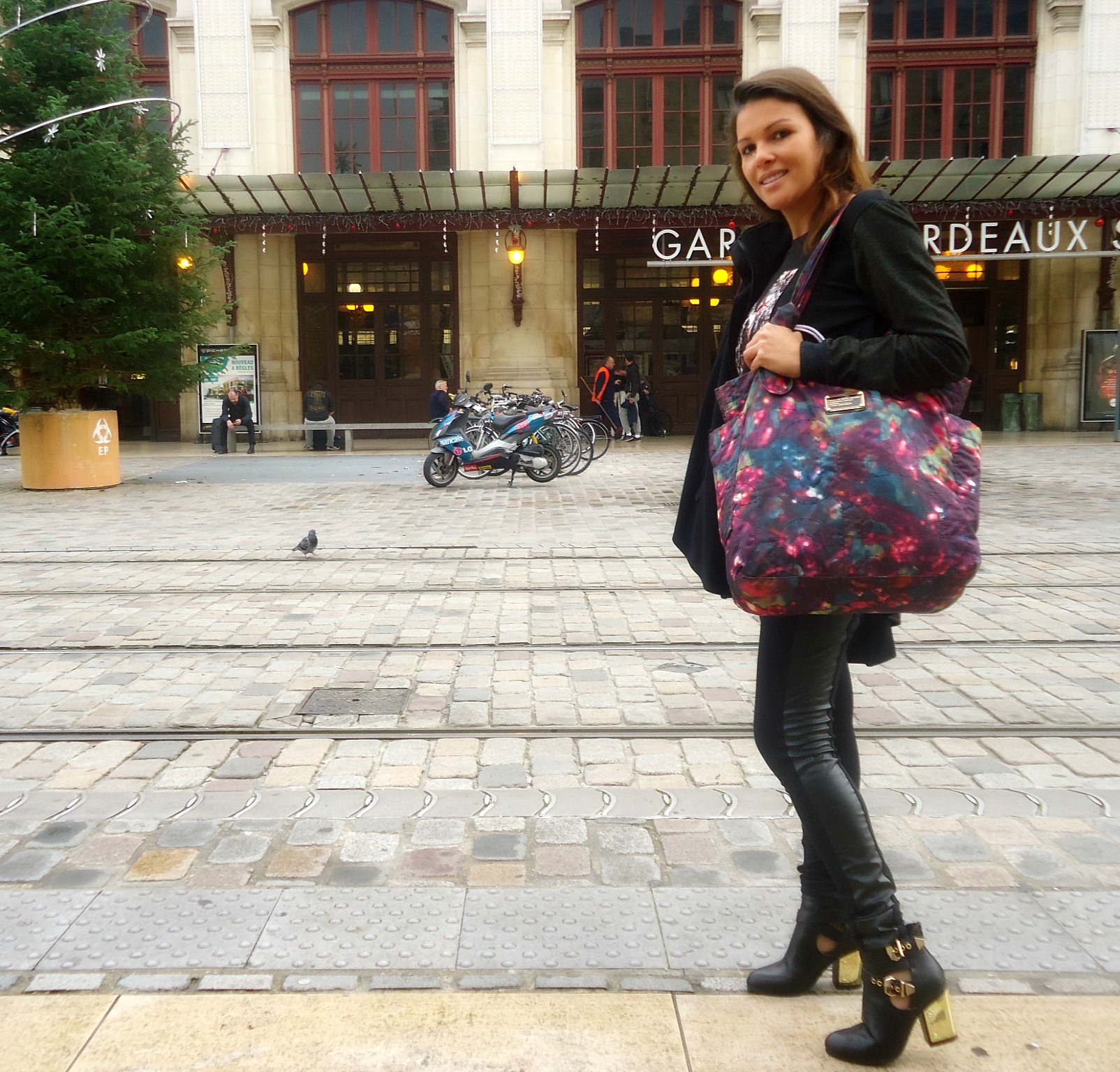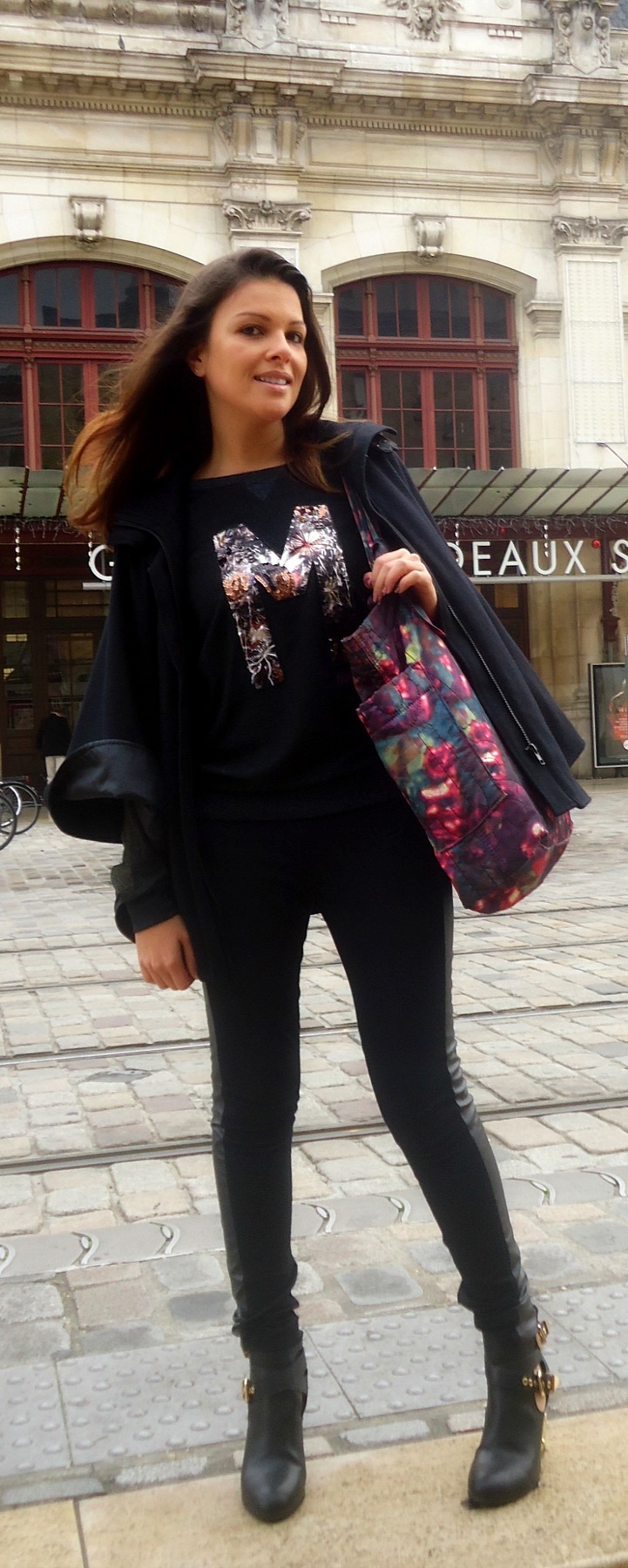 L’avantage de ses vêtement c’est qu’ils ont un coté relax, cocooning sans le paraître. Le coté brillant et travaillé du sweat le rend classe et colle pile poil avec l’ambiance de Noël qui se dégage à Bordeaux. Quant au legging, sont aspect bi matière, mi-maille / mi-similicuir, lui donne un coté plus city que lazy.