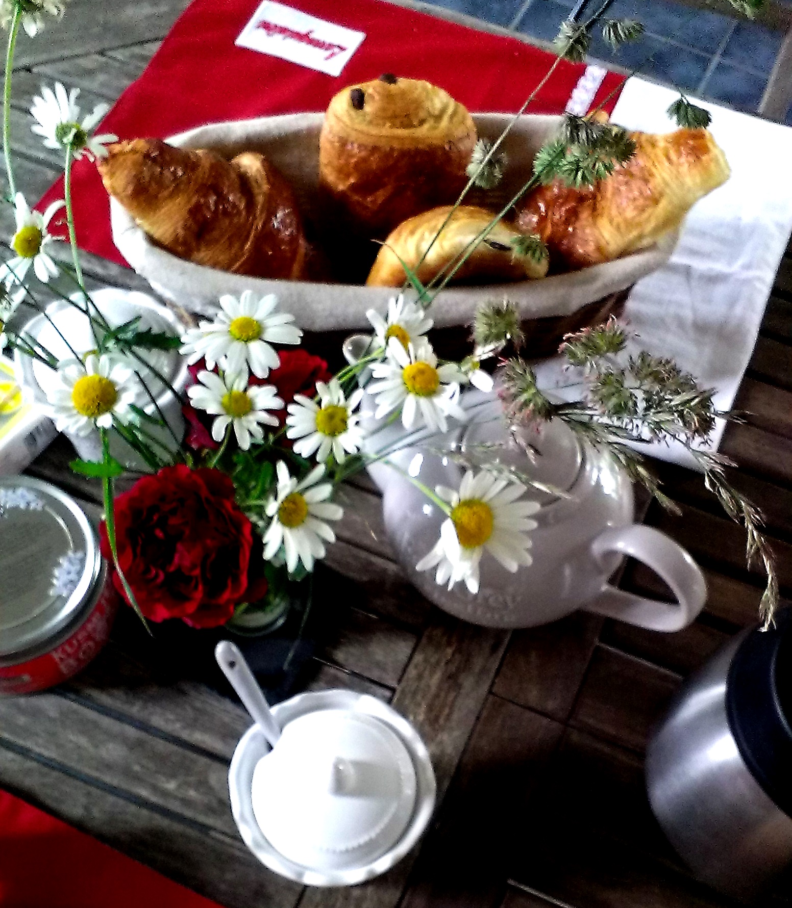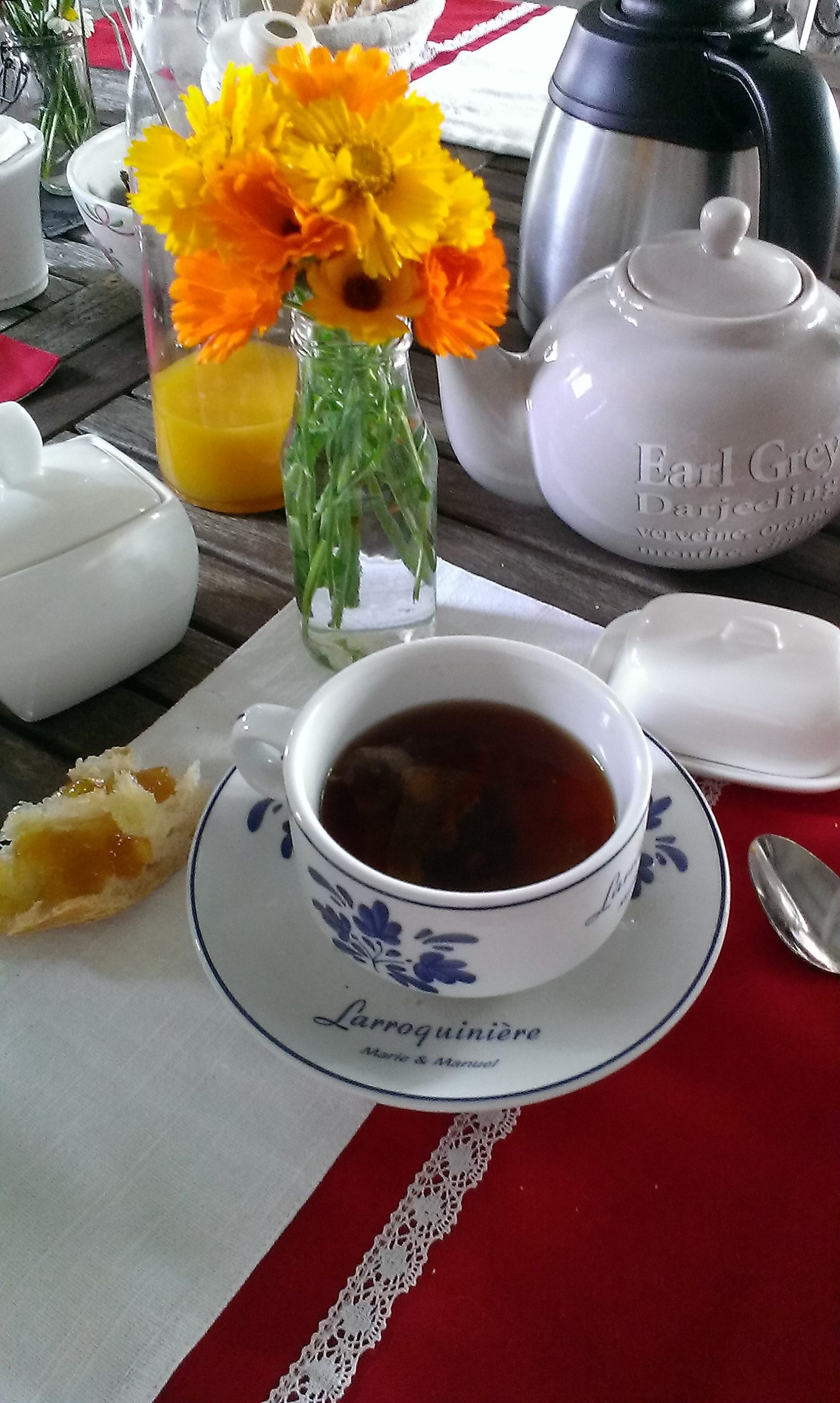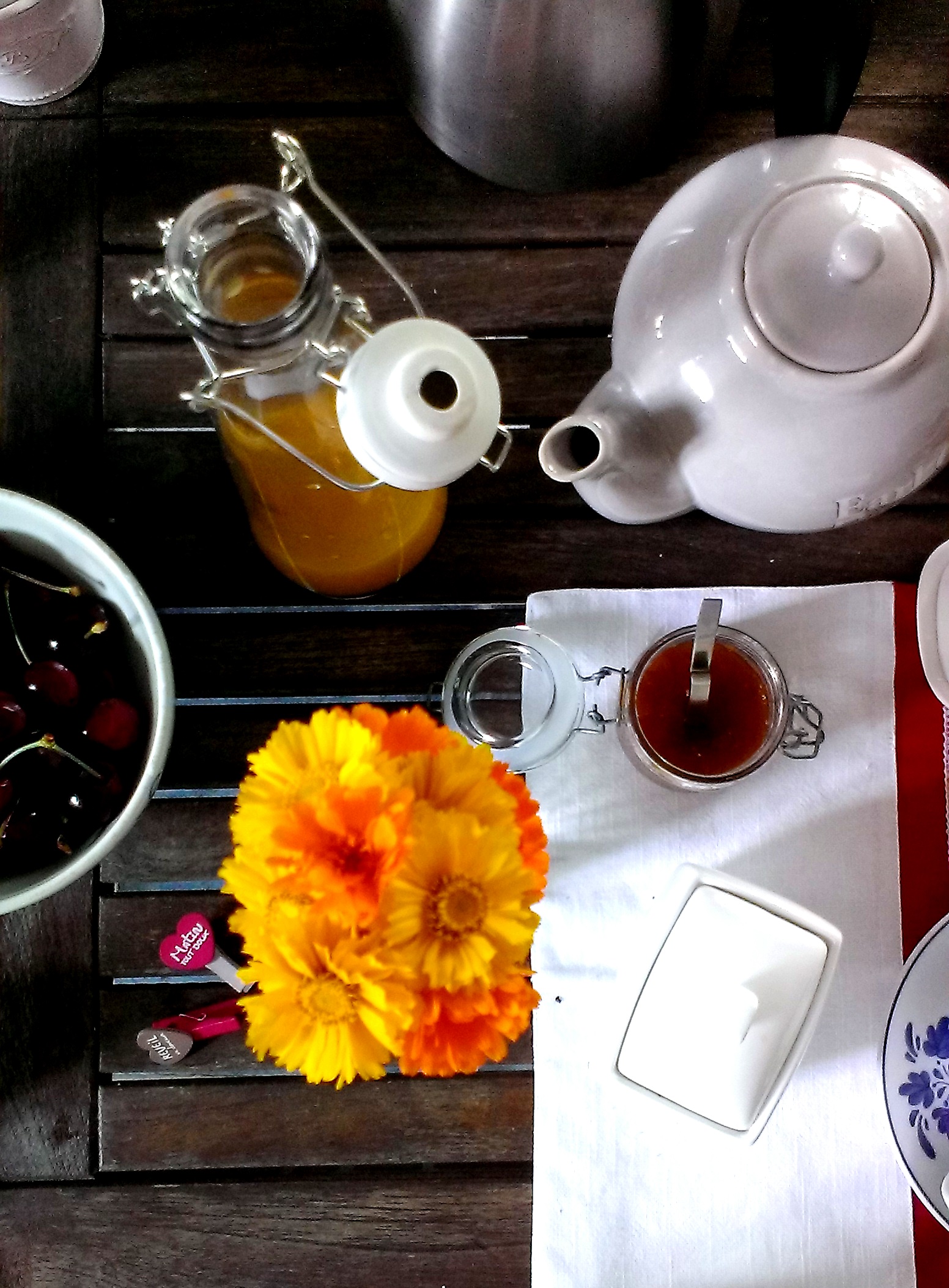 Confitures, Miel, Croissants & Chocolatine… Et puis il y a aussi du jus d’orange frais et des cerises cueillies ce matin. Le tout accompagné d’un Thé Kusmi…Un vrai festin! Autant vous dire que les dernières tartines tiennent moins de la faim que de la gourmandise… En même temps, je suis les conseils de ma grand-mère ” Mange, Mange, car tu ne sais pas qui te Mangera!”