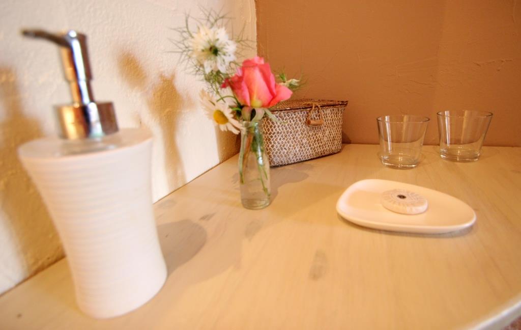 Notre chambre (n°4), située en fond de dépendance, est décorée avec goût dans un style romantique. Des magazines, romans et brochures sont mis à notre disposition ainsi que du thé et des financiers choco-coco. Idéal à l’heure du Quatre-Heure.