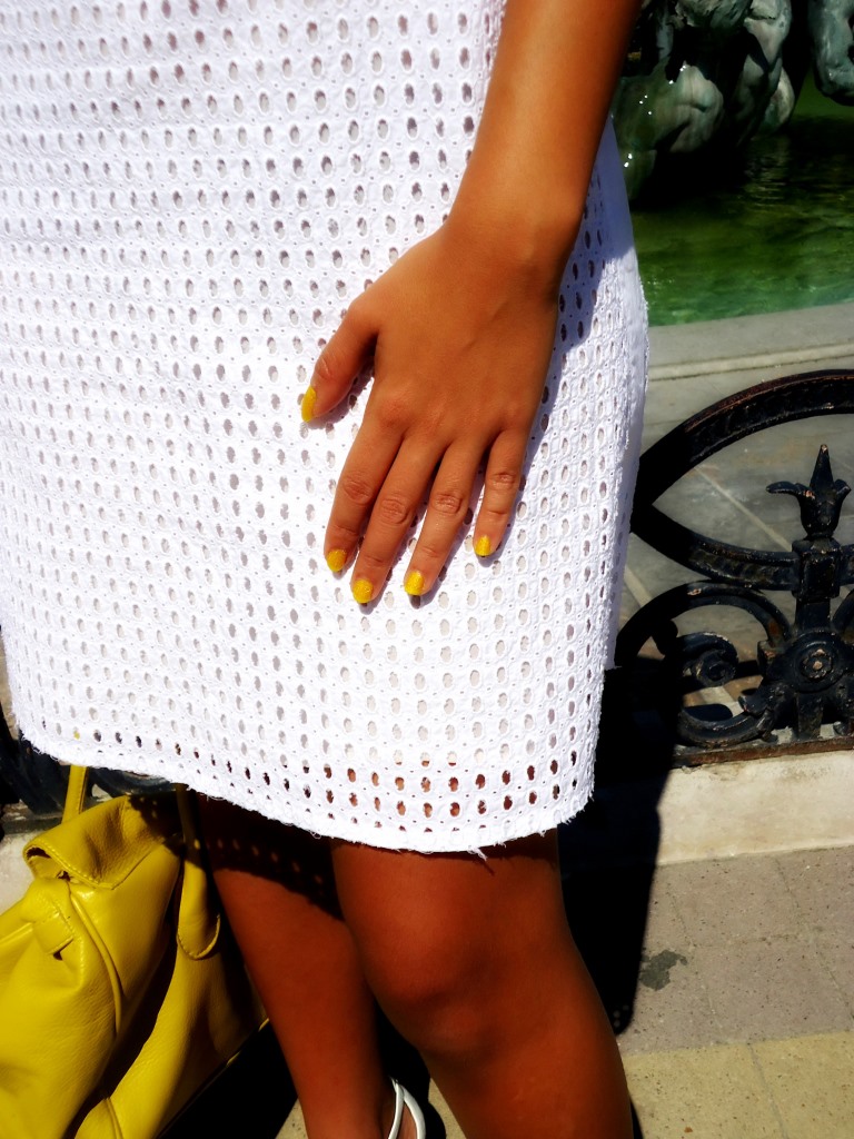 Alors histoire de ne pas ressembler à une communiante, j’ajoute du jaune pour donner du pep’s à cette tenue. Un sac canari et mon vernis OPI ” I’just can’t Cope- Acabana”, et le tour est joué. Une tenue été/rentrée plutôt smart pour commencer la semaine en beauté. En plus le jaune est une des Hit Colors de la saison donc je vais pouvoir porter ce sac et ce vernis cet Hiver (Ô joie!).