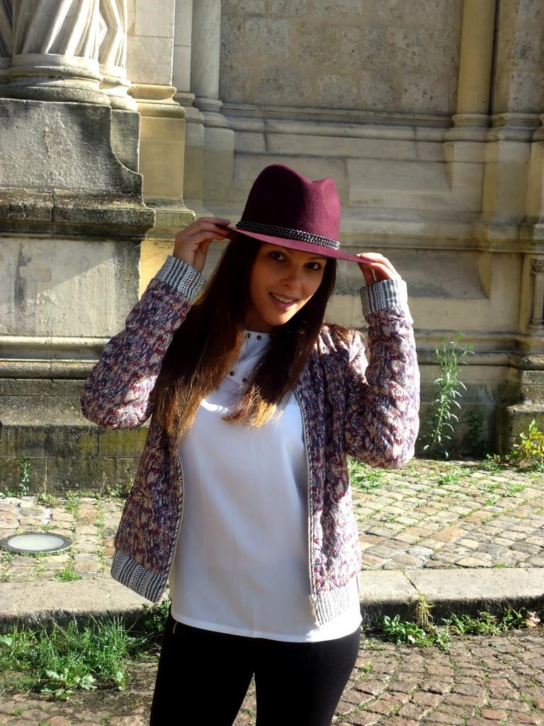 Le Bordeaux du chapeau et le rose des bottines se retrouve dans la veste Vila. Et en alliant ces pièces à un top blanc et un bas noir, j’évite le carnaval des couleurs! Quant au top blanc, il permet d’illuminer le teint, et le legging noir affine les gambettes! (Christina Cordula, sort de ce corps!)