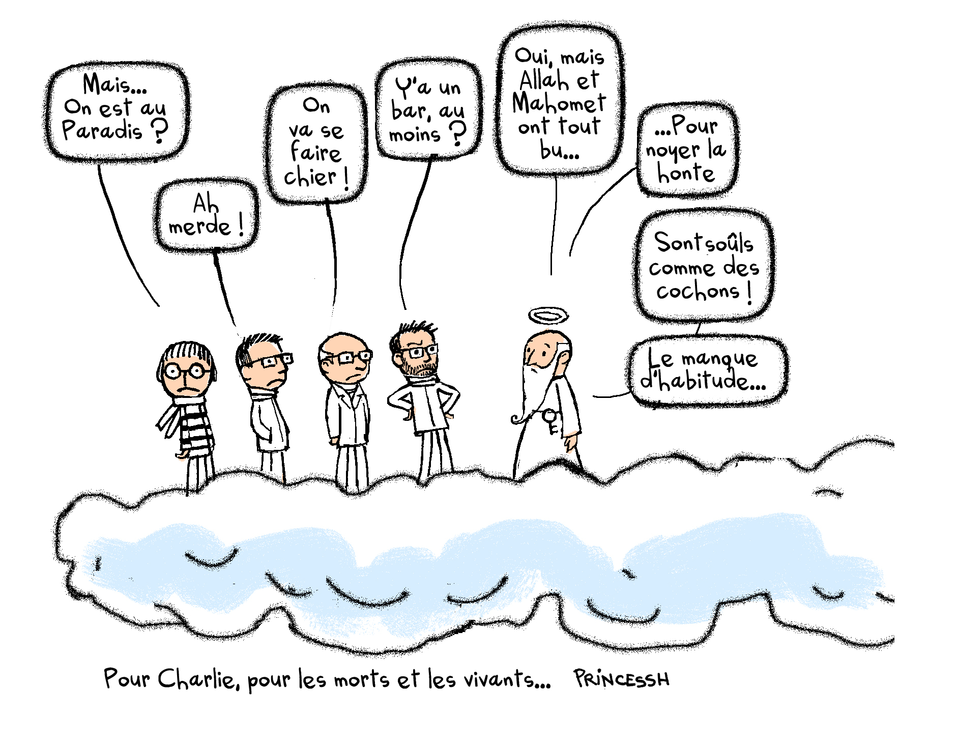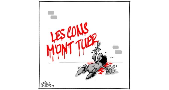 Comment peut-on tuer pour de simples griffonnages sur un bout de papier ? Comment peut-on massacrer des hommes dont le seul crime fut d’être des bouts en train, se moquant de tout et de tous ? L’humour serait-il devenu un crime de lèse-majesté ? Dieudo fais gaffe, t’es le prochain sur la liste…