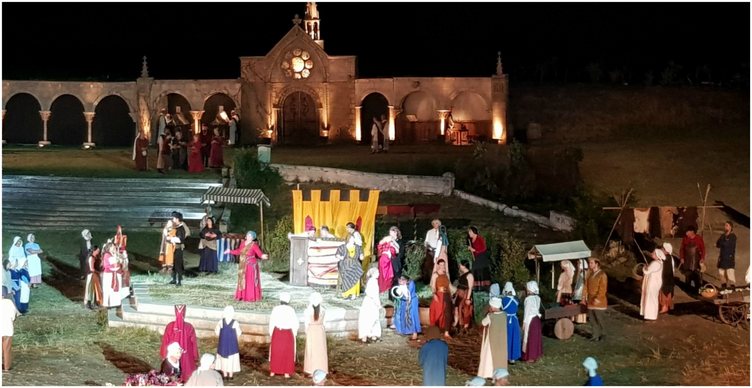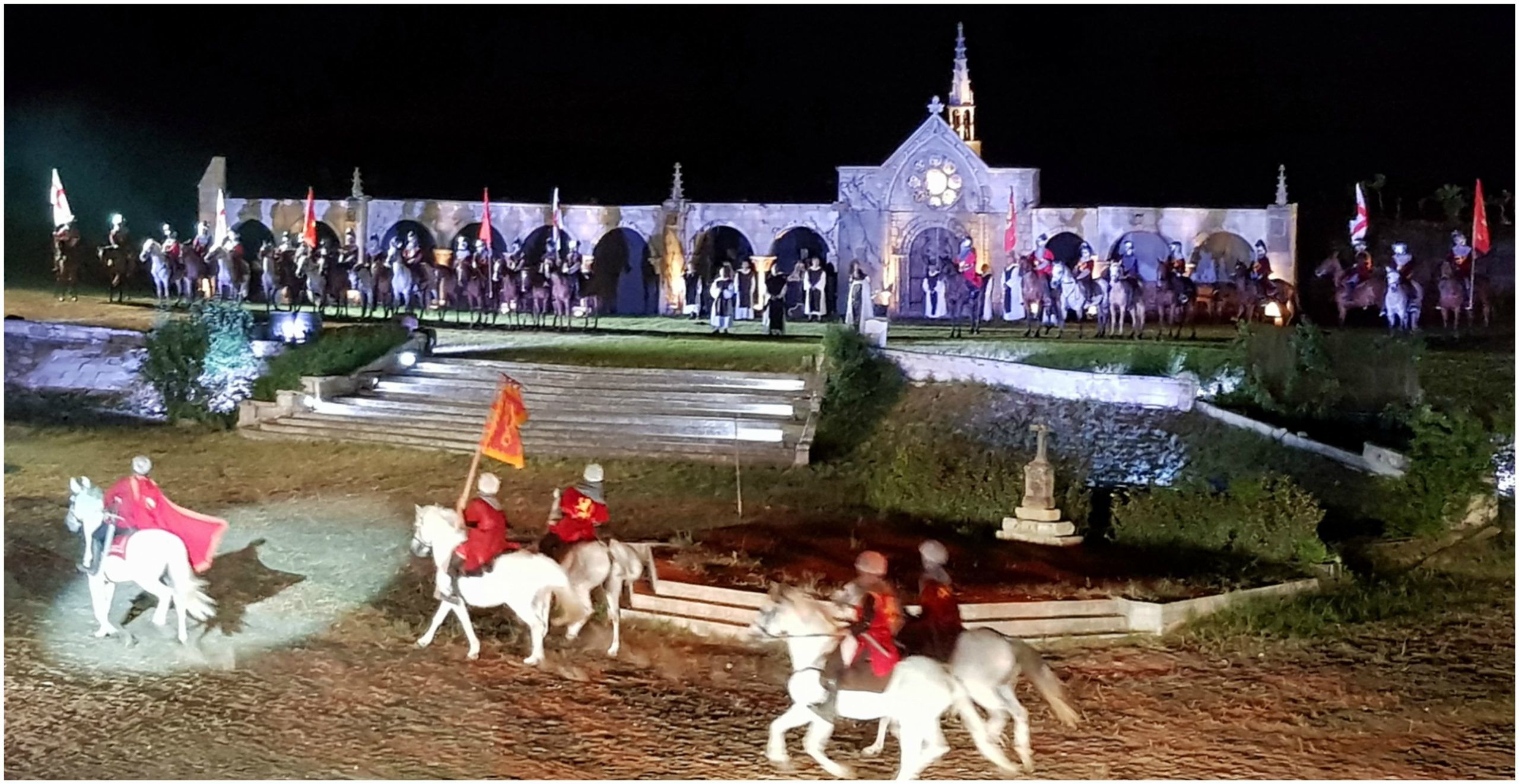 Le spectacle de la bataille de Castillon, lui, se déroule au pied du Château Castegens. C’est à Belvès de Castillon à quelques pas du lieu de la véritable bataille de Castillon. Ici, ce sont 600 bénévoles dont 400 batailleux (terme castillonnais désignant l’ensemble des amateurs passionnés jouant le spectacle) et 50 cavaliers qui donnent vie à ce spectacle historique en plein air sur 7 Ha d’aire scénique. Mais au-delà de la bataille, des chevauchés, des cascades et des effets pyrotechniques, ces 95 minutes de spectacle nous replongent au coeur du Moyen-Âge, entre fermes et auberges, marché en plein air, scènes de vendanges, saltimbanques, arracheurs de dents et marchands ambulants.