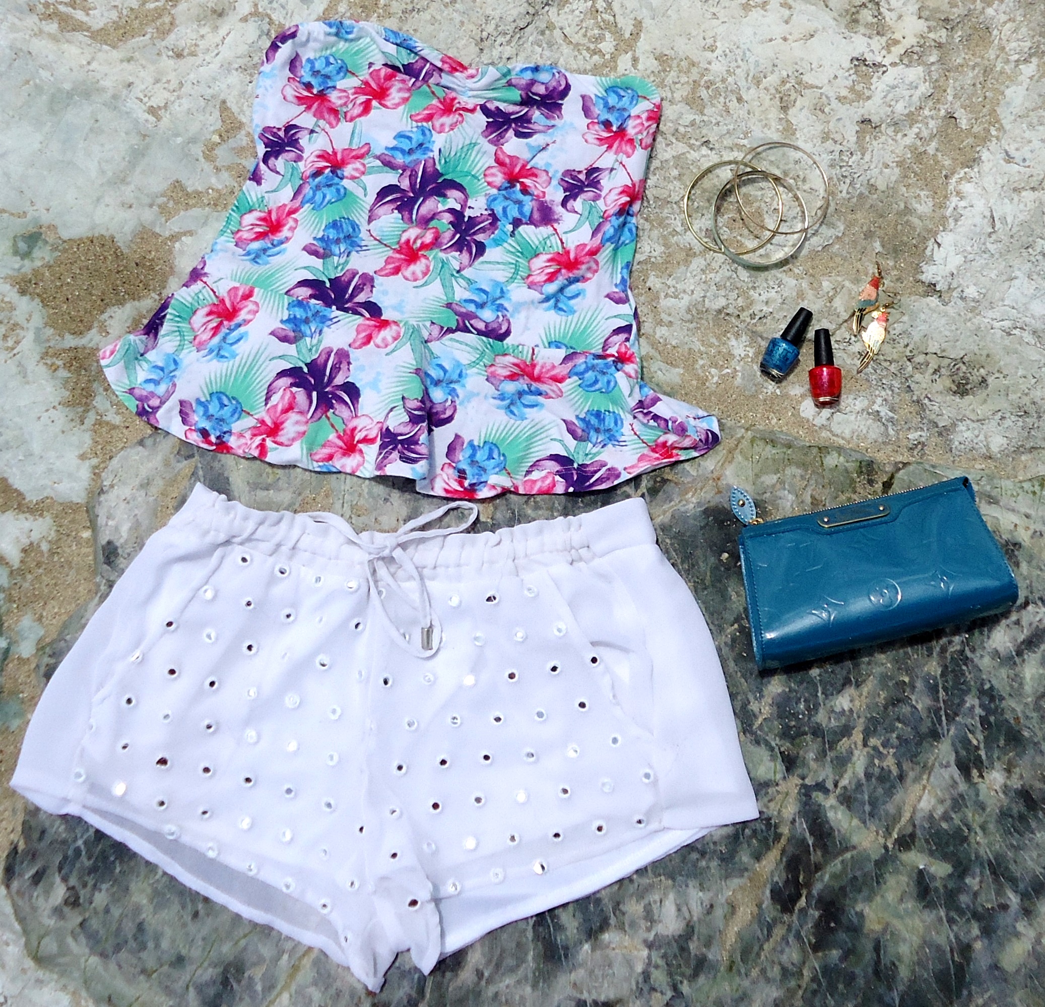 Pour une journée bateau, l’idéale est d’avoir un chapeau et une tenue légère, si possible sans manche pour éviter les “vilaines” traces de bronzage. J’ai choisit un imprimé “fleur des îles” dans les tons turquoise, violet, fushia pour être en parfaite adéquation avec notre destination Caribéenne. Quant au choix d’un bas blanc,il met en valeur le teint hâlé et n’attire pas le soleil.
