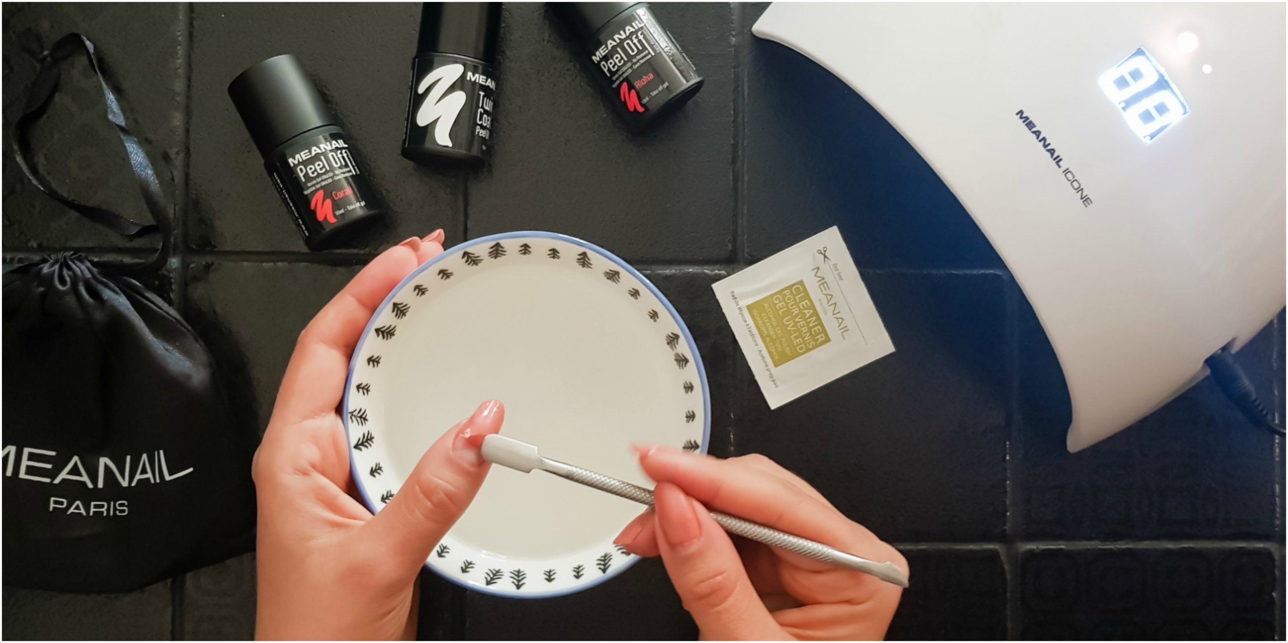 J’ai été ravie de collaborer à nouveau avec la marque Meanail car j’aime beaucoup les vernis peel off. En effet, je peux changer de couleur de vernis chaque semaine; Et il n’y a pas besoin de beaucoup de préparation. Il suffit de repousser un peu ses cuticules et d’avoir les ongles limés. On choisit son vernis, on sort sa lampe UV, on applique et on catalyse. En moins de 15 min, j’ai une manucure impeccable qui dure entre 5 et 7 jours. En effet, si je fais du bricolage ou si je lave ma vaisselle sans gants, il se peut que ma manucure ne tiennent que 4 à 5 jours. Mais si je suis sur une semaine lambda où je travaille surtout sur l’ordinateur, le vernis peel off tient la semaine. D’ailleurs il tient bien mieux lorsque j’applique avant et après le vernis transparent Twin Coat.