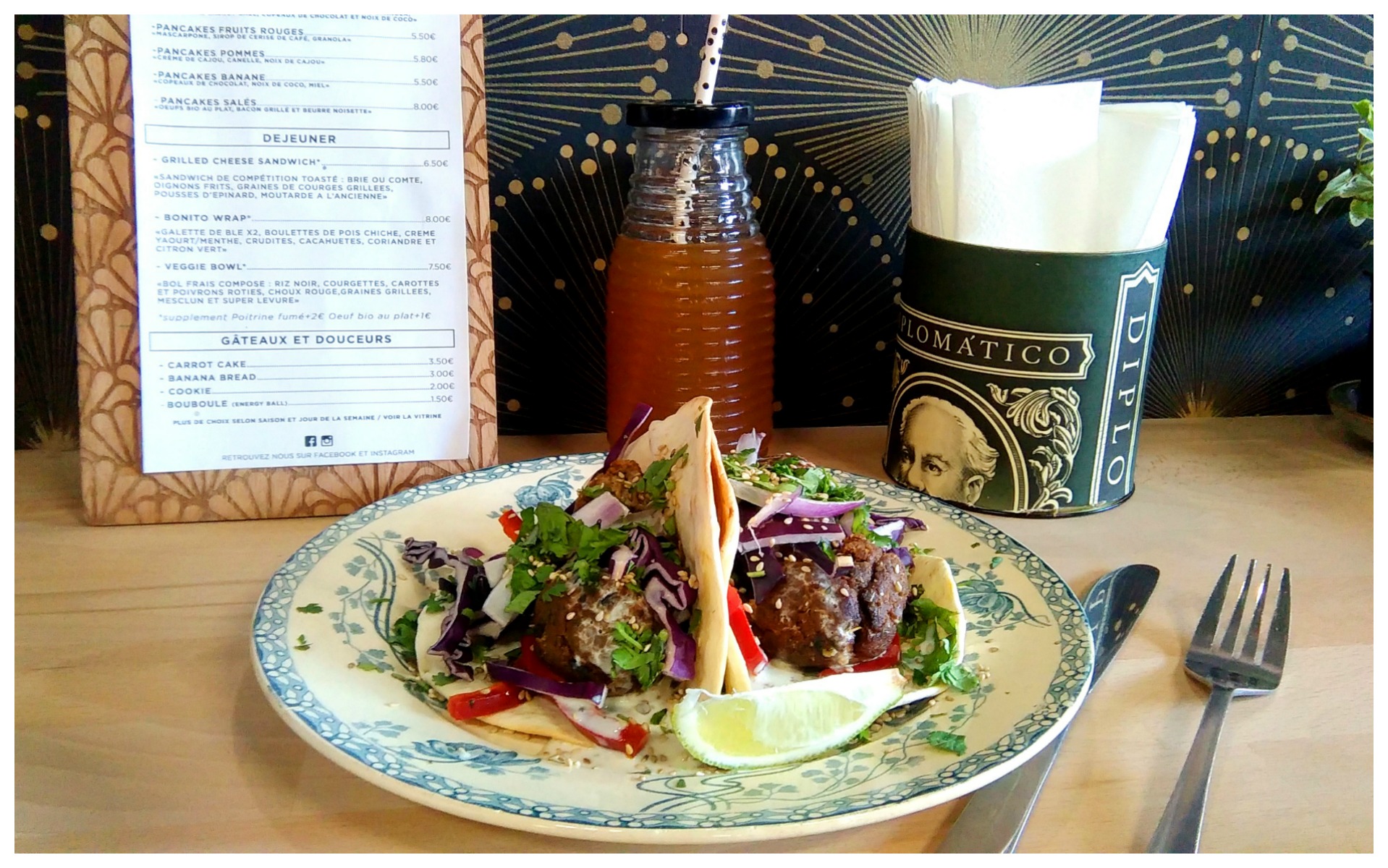 La première fois que nous sommes venus au Partisan Café avec ma soeur beka et mon chéri, la carte était un peu différente. Nous avions goûté différents plats et mon chéri et ma sœur avez opté pour les pancakes salées avec œufs au plat bio, bacon et beurre noisette ainsi que des scones au bacon et un grilled cheese au comté, graines de courge, moutarde à l’ancienne et pousses d’épinard. Pour ma part, ce fut bol de granola complet avec yaourt soja, fruits rouge, granola, energy ball et copeaux de chocolat/noix de coco. Coté salé, je n’ai pas pu résister au bonito wrap, deux galettes de blé agrémentées de boulette aux pois chiche, coriandre et sauce à la menthe. Un vrai délice!