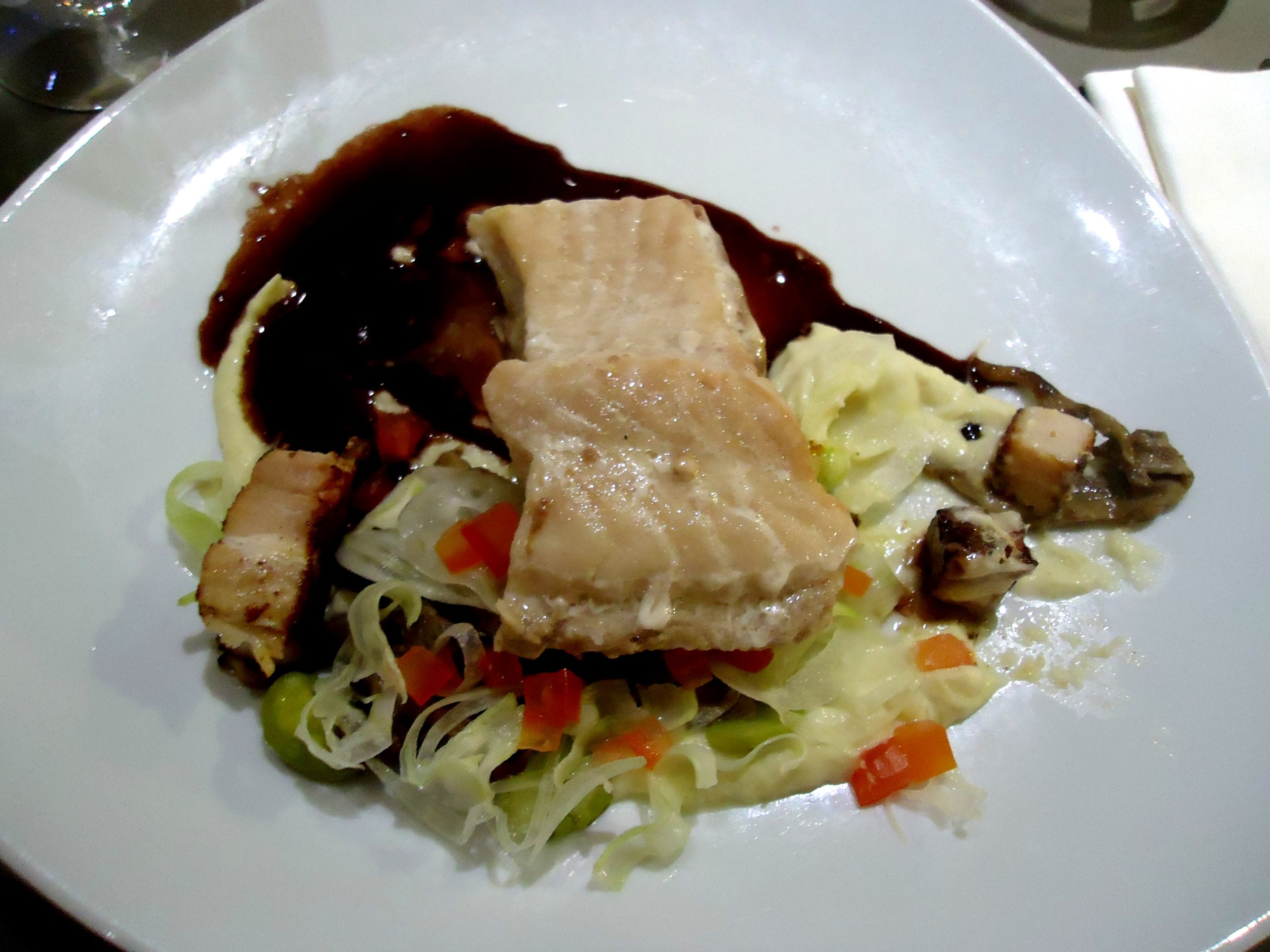 Allez, soyons fou, mettons nous à l’heure russe et gouttons tout ça! Nous avons donc commencé par le tartare de gambas, caviar et consommé végétal parfumé au “cachou” de Toulouse. Fin, délicieux, parfait pour une mise en bouche très mer. Nous avons ensuite pris l’esturgeon confit dans l’huile d’ail, avec son lard fumé et sa mousseline de fenouil, quelques champignons, le tout agrémenté d’une sauce vin rouge à tombé! Le mariage esturgeon/lard peut paraître incongru mais c’est une véritable réussite!