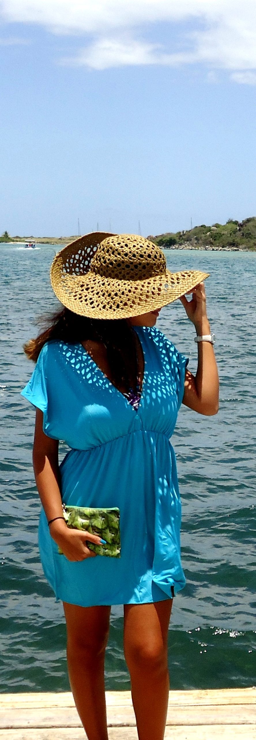 Coté Look, une tunique turquoise en accord avec mon vernis OPI Fly dans le même ton, et un maillot imprimé « Tropical » dans les vert anis, violet et turquoise (oui, j’Adore le Turquoise). Détail important, je ne pars jamais à la plage sans ma capeline ou ma visière et ma crème solaire (Lait Protect & Bronze SPF 30, Nivea Sun). J’ai une peau qui bronze très vite donc nul besoin de m’exposer des heures au soleil pour avoir un teint hâlé. Cependant, le soleil des Caraïbes étant très fort, il est important de se protéger histoire de préserver son capital jeunesse.