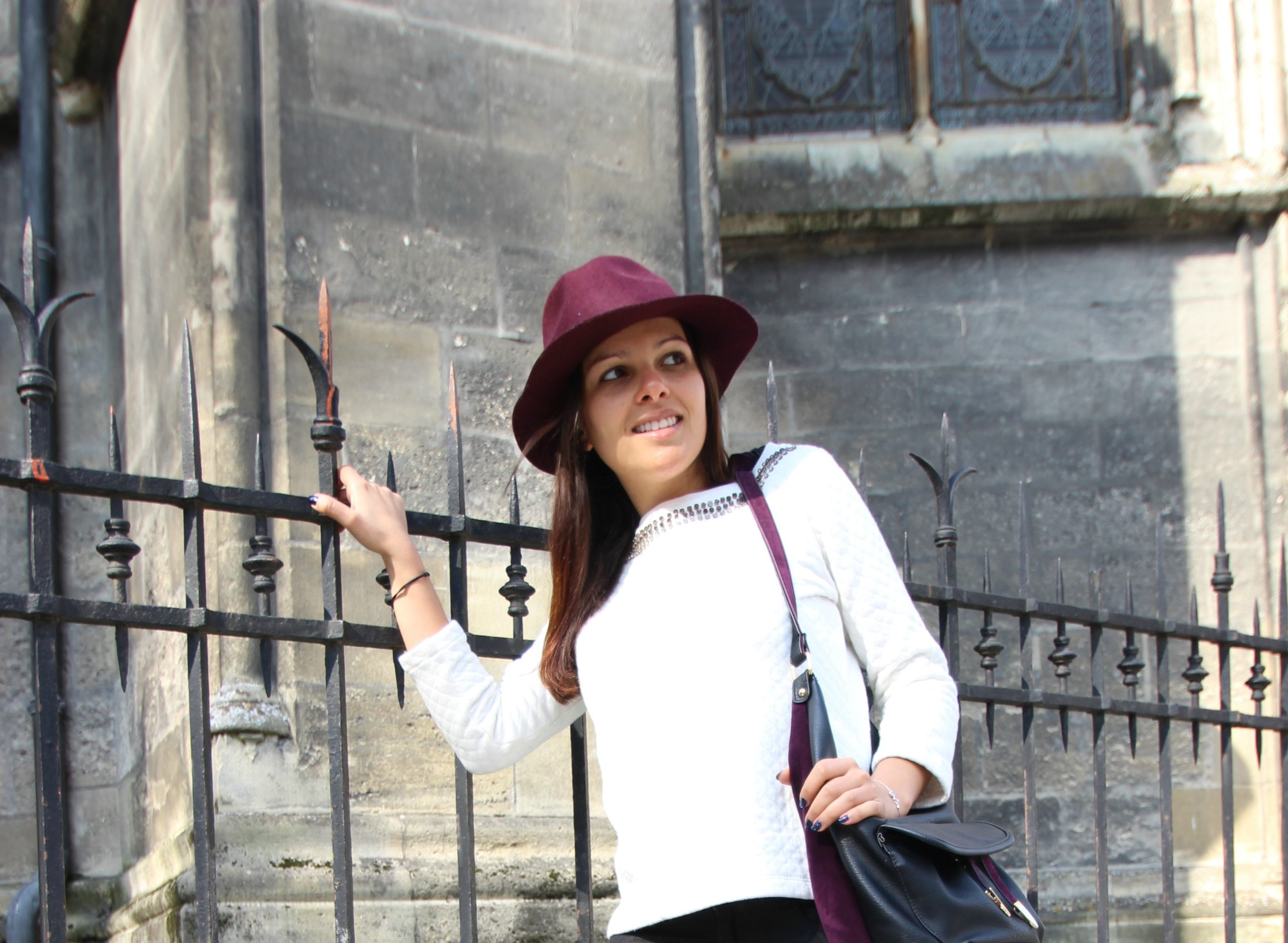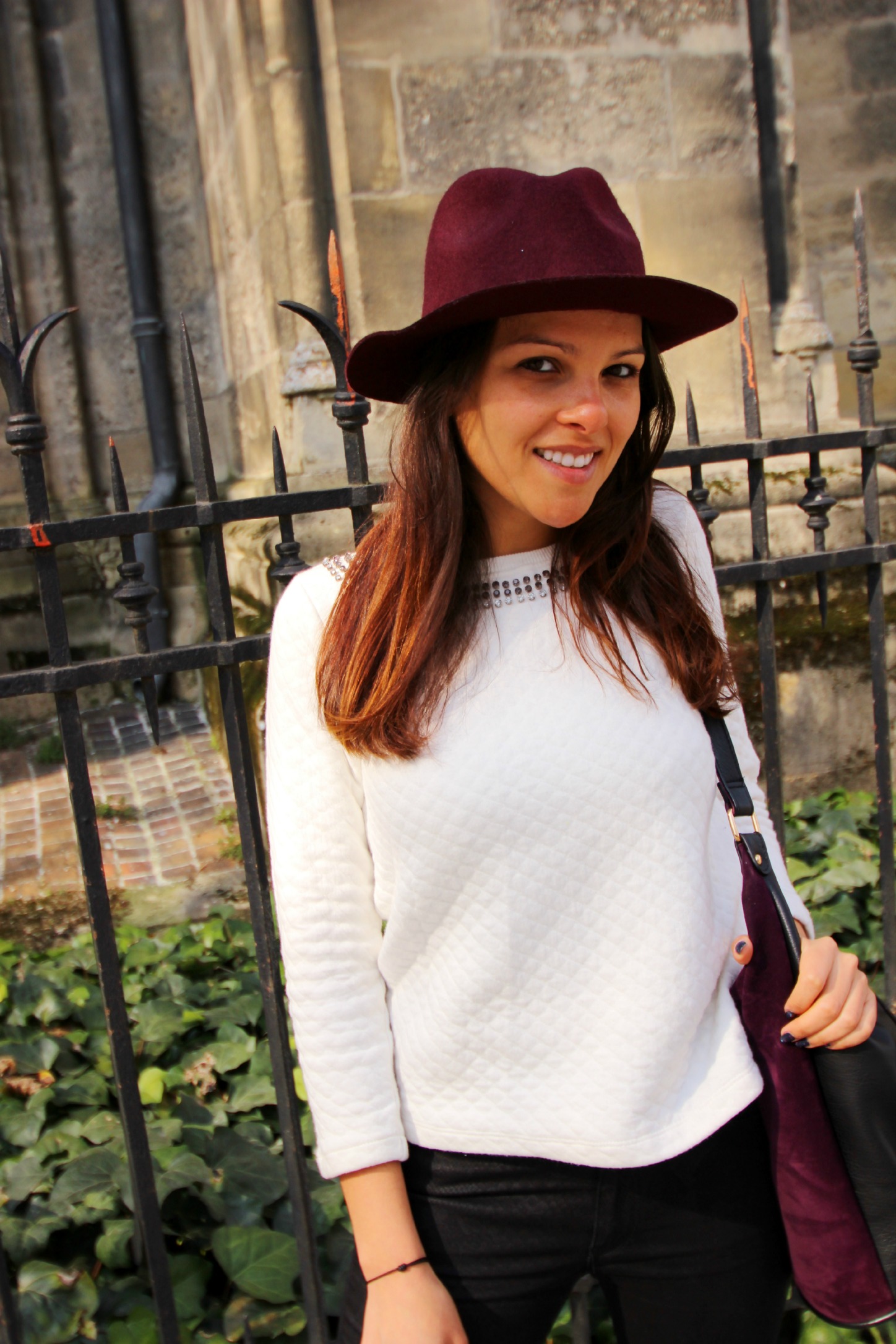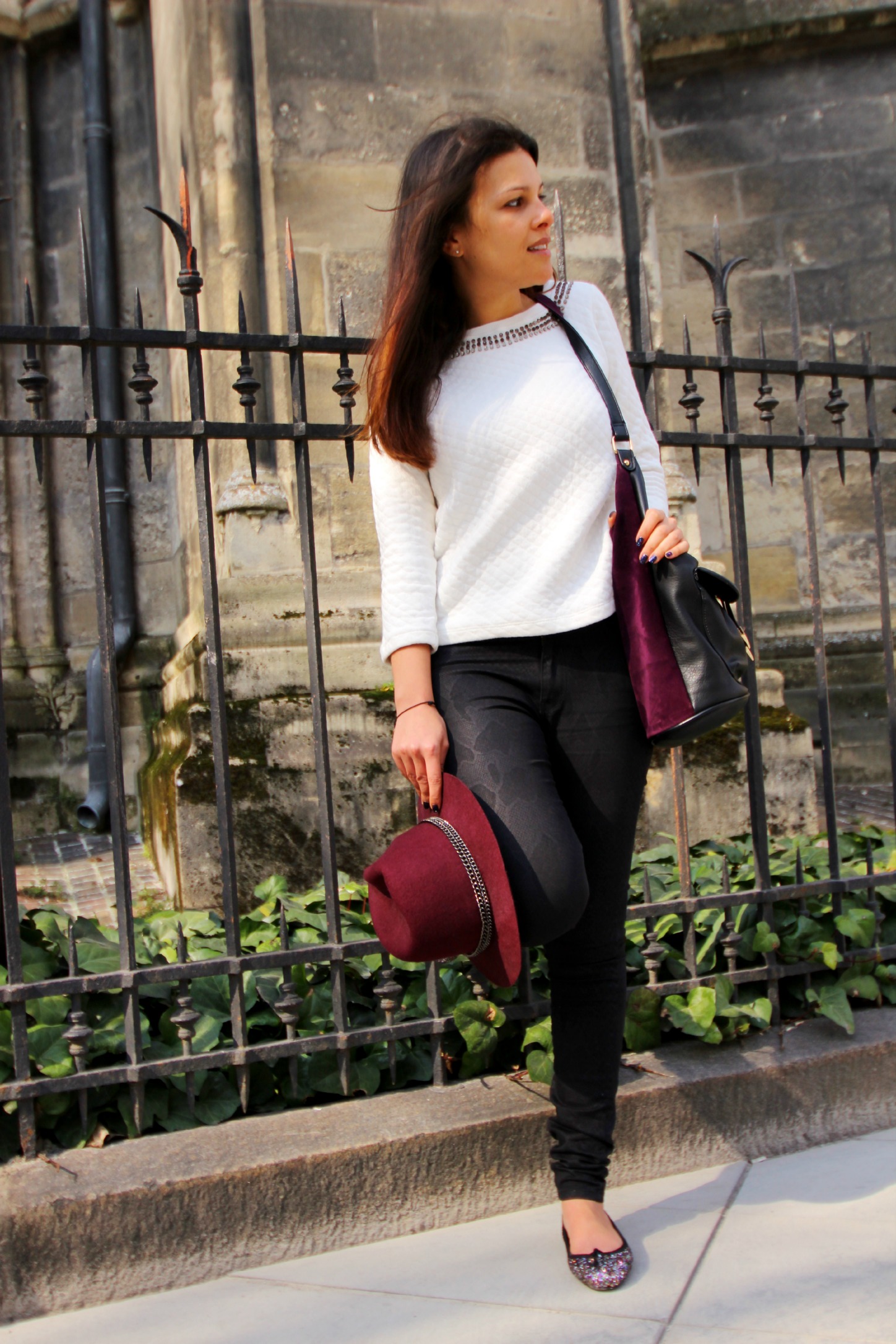 J’ai choisi ce Chapeau Pimkie et ce Sac Eurodiff qui sont dans les mêmes tons mi Prune / mi Bordeaux et qui s’accordent bien avec les Ballerines à paillettes. Pas de bijoux en plus vu que le col à strass du Sweat fait office de collier.