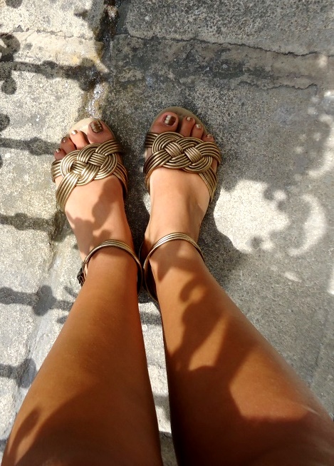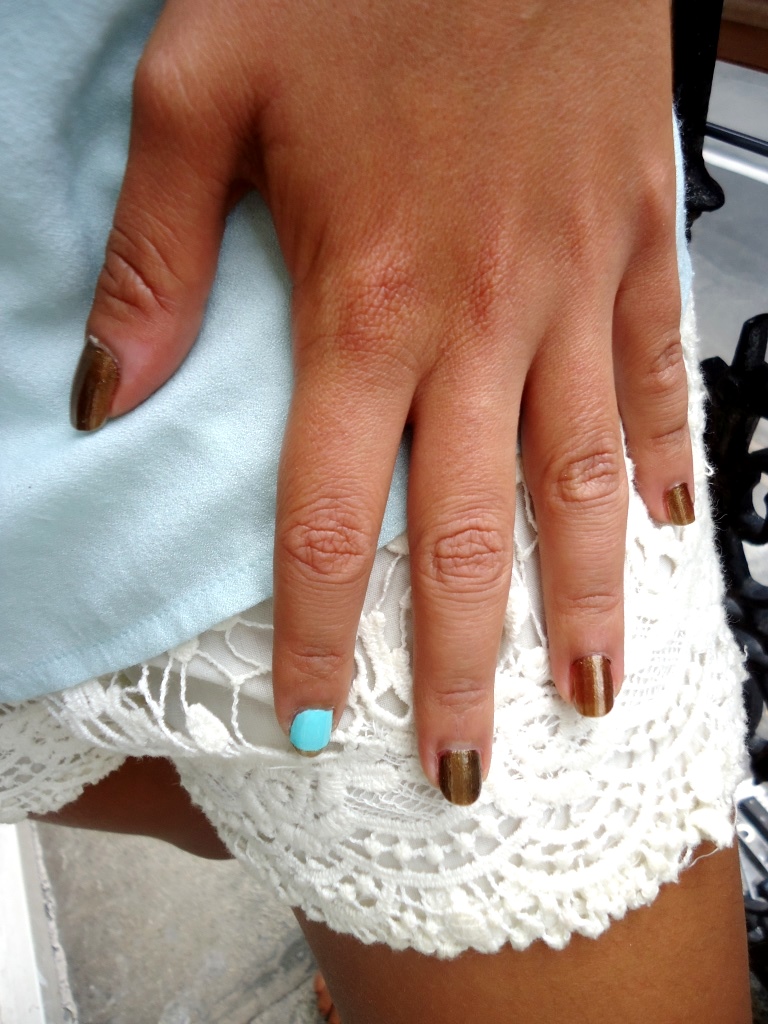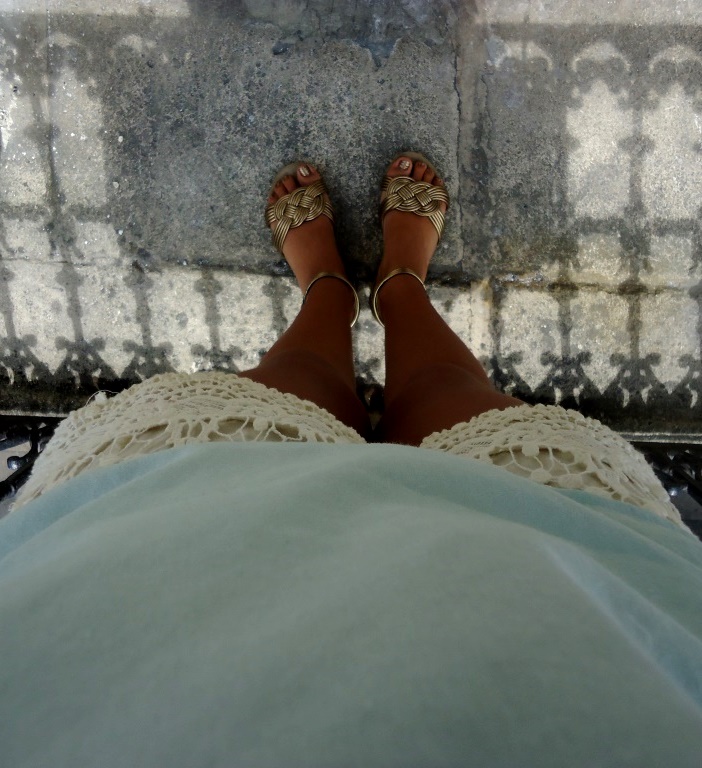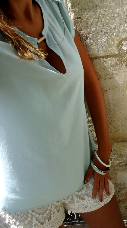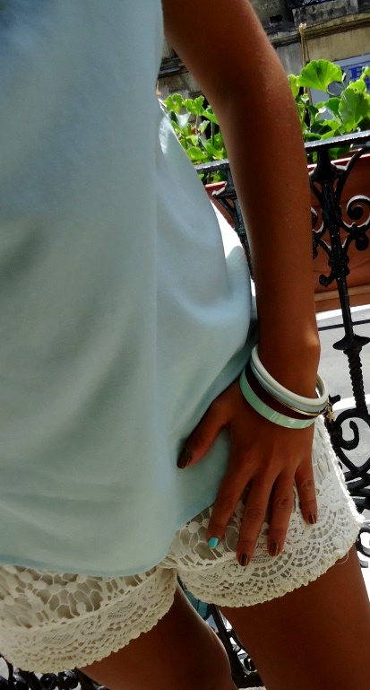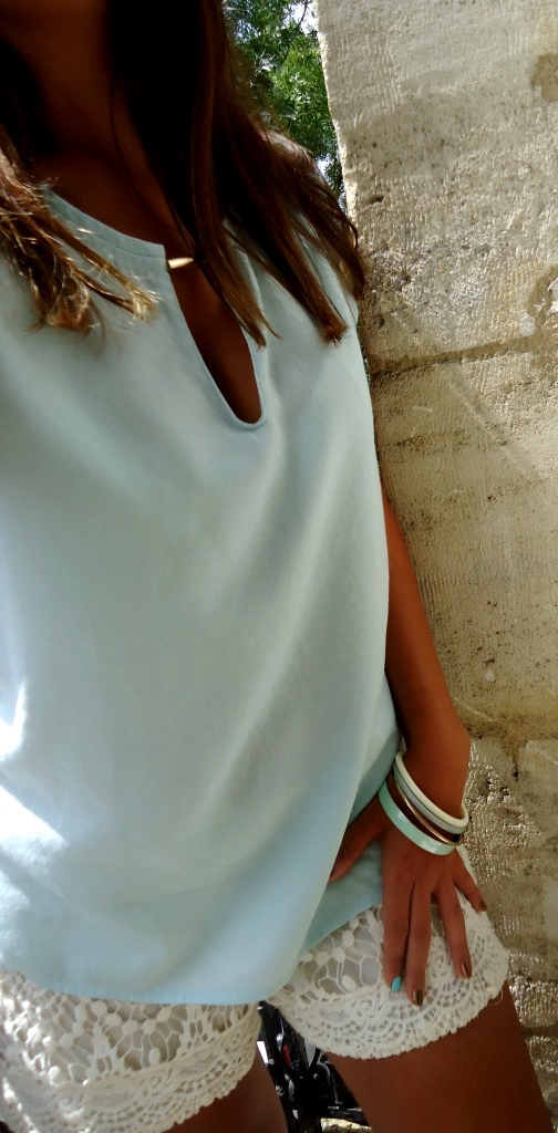 Un lundi comme je les aime, baigné dans la lumière, même si le soleil joue à cache avec les nuages, comme pour annoncer la fin des vacances… Un lundi tranquille, doux, calme et un look sweet qui va avec. Un top vert amande claire presque marshmallow et un short blanc cassé en crochet. Une touche Bronze avec les sandales et le vernis pour rehausser ce look un peu trop sage, et le tour est joué! Un look Sweet Monday pour un lundi ensoleillé!