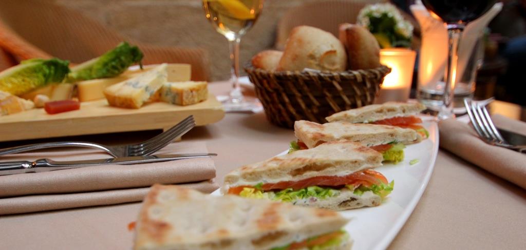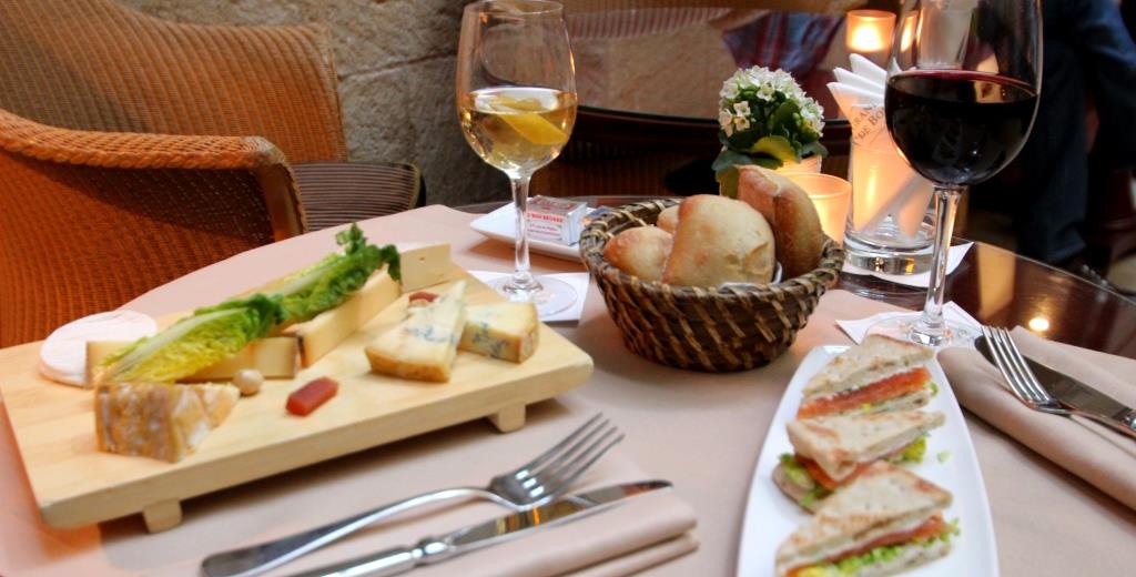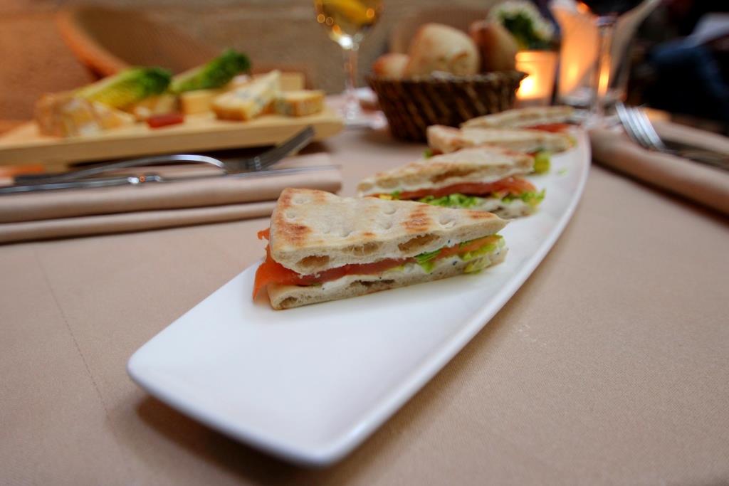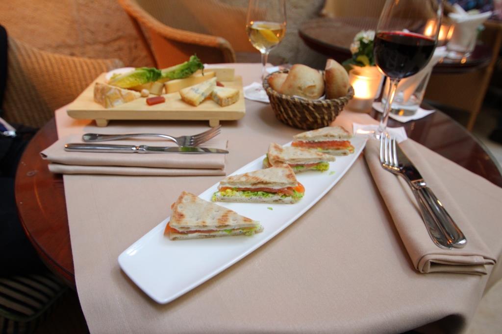 Après avoir parcouru la carte, nous jetons notre dévolu sur une planche de fromages ainsi qu’un assortiment de pains nordiques au saumon fumé. Et nous accompagnons ces mets d’un verre de Lillet Blanc pour moi et d’un verre de Pessac Leognan 2009 (Réserve de Malartic) pour mon cher et tendre.