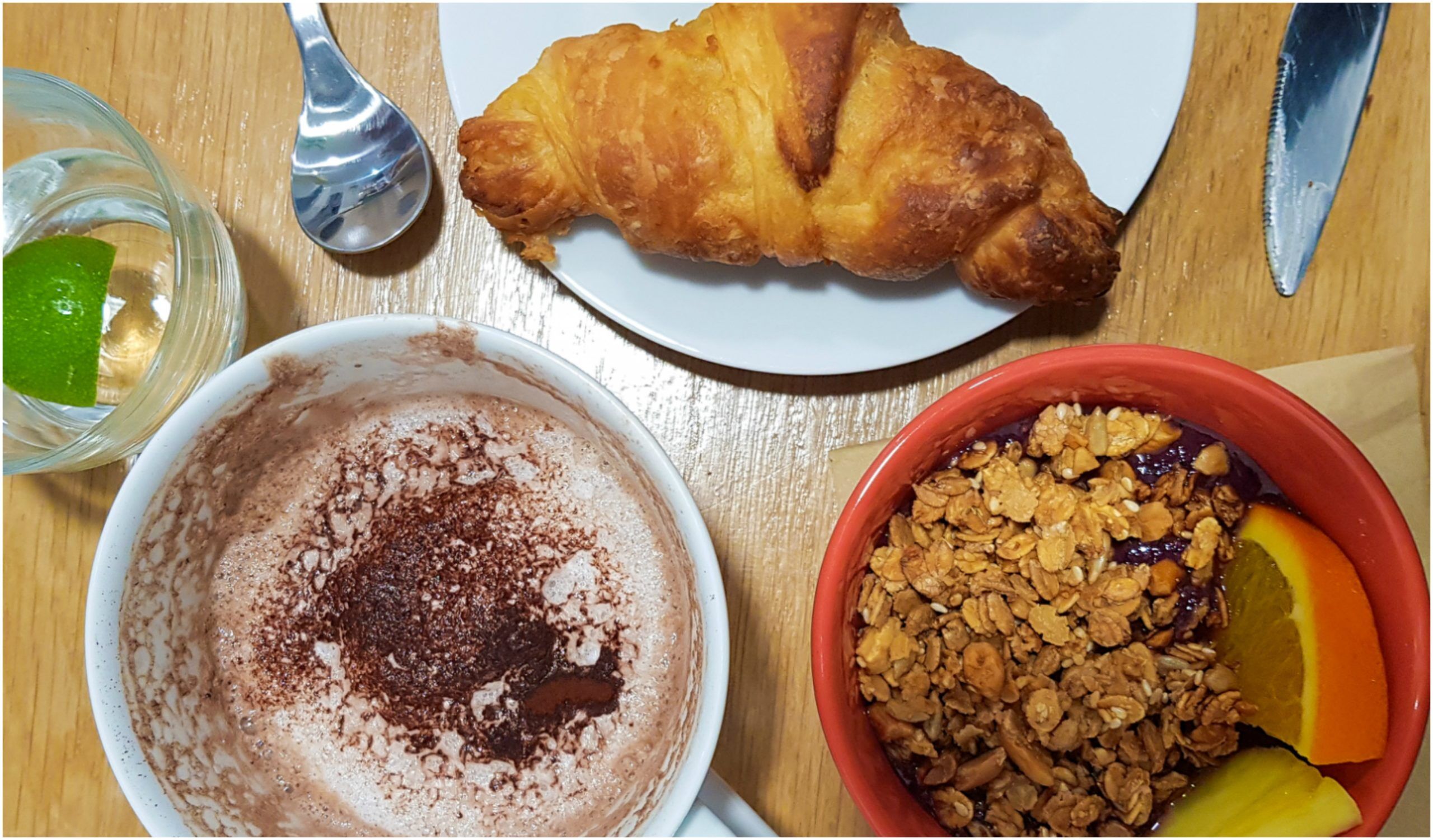 La partie sucrée n’est pas en reste. En effet, vous aurez le choix entre deux desserts au granolas: Des perles de tapioca au lait de coco accompagnées de fruits ou des graines de chia au lait d’amande et aux fruits rouges. Nous avons choisit ce dernier avec mon conjoint. Nous avons vraiment adoré ce dessert. Quant à la douceur du jour, mon amoureux s’est laissé tenter par un clafoutis poires et cardamone. Pour ma part j’étais très intriguée par les croissants vegan. De plus, je ne regrette pas mon choix. Un vrai délice. Croustillant au dessus, moelleux à l’intérieur, dorés à souhait … Bref, une vraie réussite!